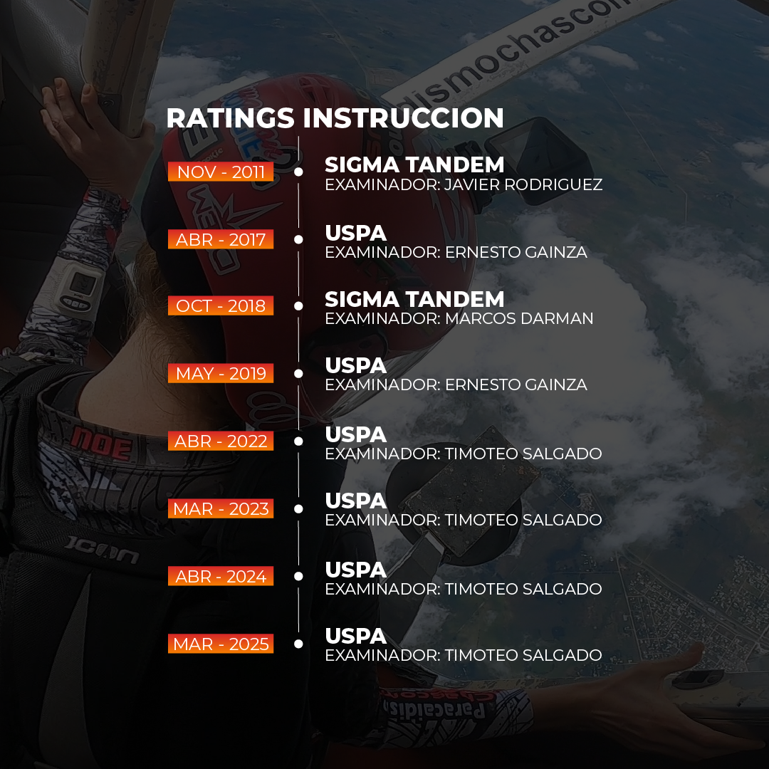 Organizamos cursos de Instructor Tándem Sigma y todos los ratings de instrucción de la USPA: Coach, Instructor AFF e Instructor Tándem.